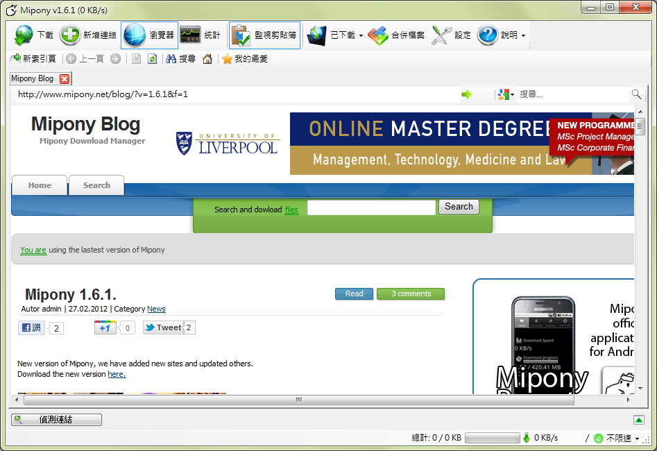 您時常下載免空的檔案嗎? 除了 JDownloader 之外,您還有其他選擇,那就是 MiPony 白馬下載器,它與 JDownloader 一樣,支援像是 Rapidshare、Badongo、Mediafire 等的知名免費空間,除了能從剪貼網址的動作去偵測下載外,還提供續傳的功能,讓您可以安心掛載等它自動下載完成,非常方便的說。