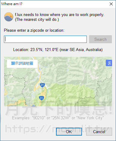 ▼ 啟動 f.lux 後會詢問您所在的地區,輸入縣市的英文基本上都找的到,選擇後點擊ok即可。