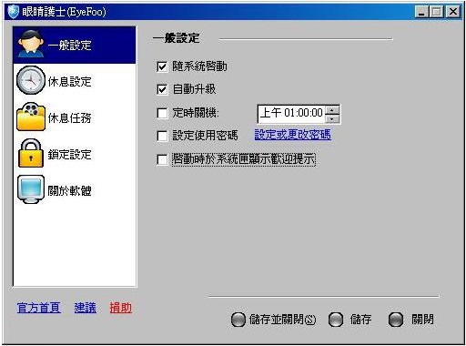 EyeFoo 眼晴護士是一款電腦使用時間控制軟體,現在許多家長一定很頭痛每天小朋友在電腦前遠遠超過在書桌前念書的時數,或者是有網路重度使用強迫症的患者無法控制自已對網路的誘惑,這款軟體就能幫上您的忙了,它能設定電腦使用的時數,而且能用密碼將系統鎖定,時間到了就會自動關機,讓您能更容易控制使用電腦的時數。
