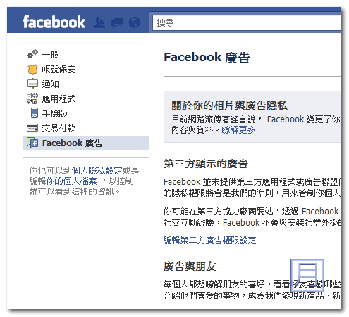 ▼ 接著進入最左下的 Facebook 廣告選項,在這裡可以編輯兩種廣告的權限設定。
