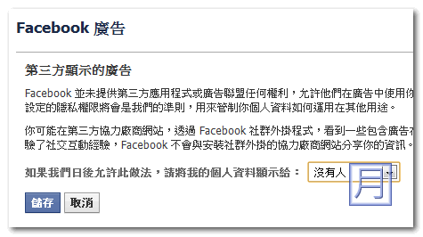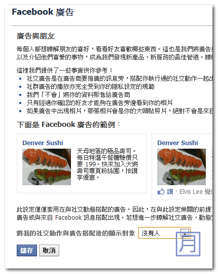 ▼ 接著再進入廣告與朋友的設定,也是將下拉的選單選到沒有人,這樣就能確保您的名字不會出現在朋友的廣告中了。
