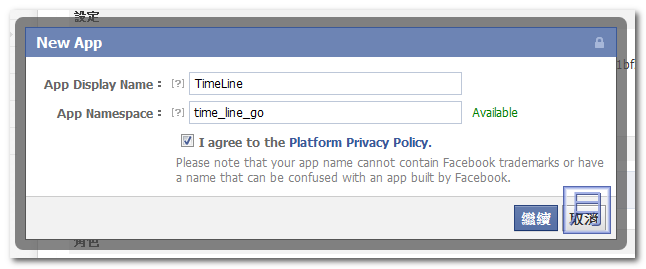 ▼ 輸入App Display Name(隨意)與App Namespace(英文字與底線組合),然後勾選同意規章,接著繼續。