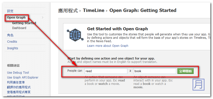 ▼ 再來請看到左上角,點擊 Open Graph,在 People can 後欄位輸入read,a 後欄位輸入 book,點擊立即開始。