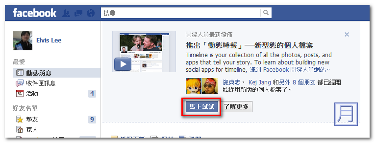 ▼ 接著再回到自已的個人頁面,有時可能要等幾分鐘,您會在上方看到詢問您是否要試用動態時報的新型態功能,點擊馬上試試,再重整自已的個人頁面就能看到像第一張圖般的時間軸模式了。