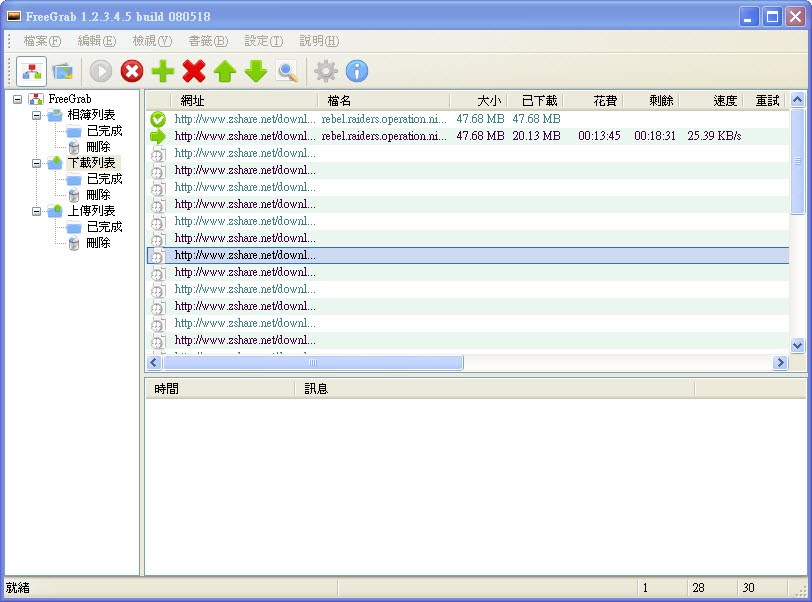 FreeGrab 是一款免費空間下載器,它能直接下載像是 Bandogo, Rapidshare, Freakshare, Xun6 等134個免費空間的分享檔案,比較可惜是部份需要驗證碼的免空要自已輸入,但能將檔案以列表式下載,讓您不需在網頁前讀秒傻等,也增加了不少的便利性。