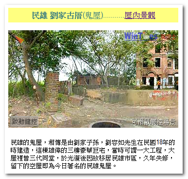 民雄鬼屋一直是台灣鬼屋界的第一把交椅,神秘的傳說加上陰森的氣氛,讓它保持著鬼屋前幾名。在鬼月的期間不知道有沒有人敢前往探險,其實網路上也有許多資料可以查詢,甚至有網站帶您逛鬼屋,您想試膽嗎? 先上網逛逛看吧。