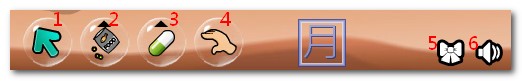▼ 下方的功能表:1.指標 2.餵魚 3.使用道具 4.採收/偷竊 5.佈置水族箱 6.音效開/關