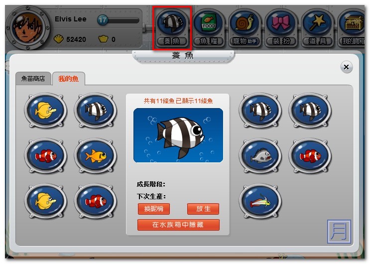 ▼ 「養魚功能」可以在「魚苗商店」中購得魚苗,然後在「我的魚」選項中顯示您想在水族箱內出現的魚,等級與能養的魚數量有關唷。