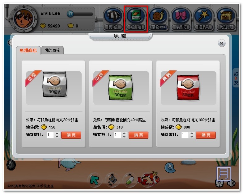 ▼ 「魚糧」也就是養魚的飼料,當魚飢餓度見底時就不會生產寶物,所以一定要餵食才能獲得寶物,魚糧的種類其實就差在回復量。另外到朋友的水族箱餵魚可以取得經驗值,建議用低檔魚糧餵,因為可以餵比較多次。