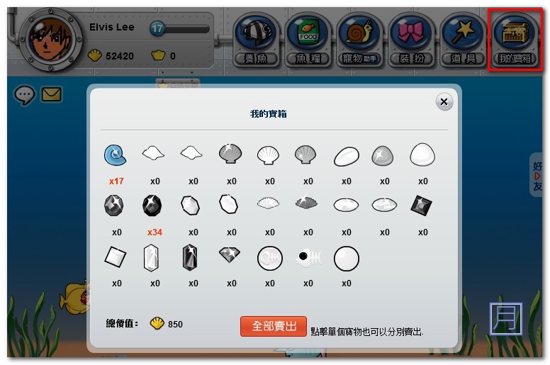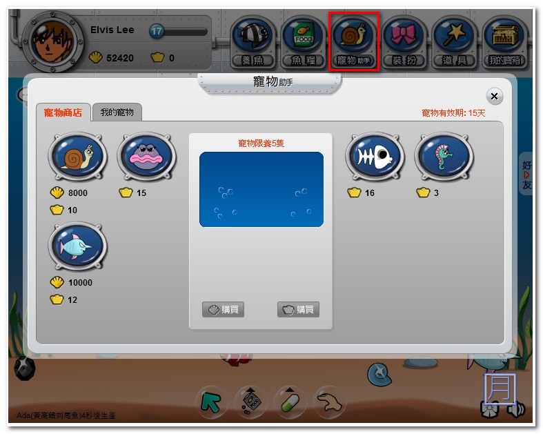 ▼ 「寵物助手」所販賣的魚貝類能幫您防止來偷東西的朋友、自動採收寶物、自動餵魚與定時寶物等的功能,但大部份都要用元寶幣買,所以看看就好了,劍魚是一定要買的,因為抓偷東西的朋友機率還頗高的。
