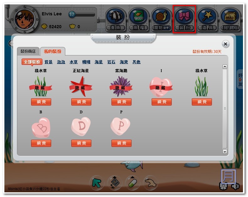 ▼ 「裝扮功能」會顯示目前您所擁有的水族箱擺飾,取得的方式可以透過朋友贈送或是用元寶幣購買。