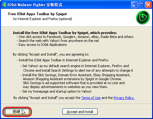 安裝須知:安裝過程請參照下面之圖片,選擇拒絕與取消勾選,避免安裝工具列或是變更首頁。