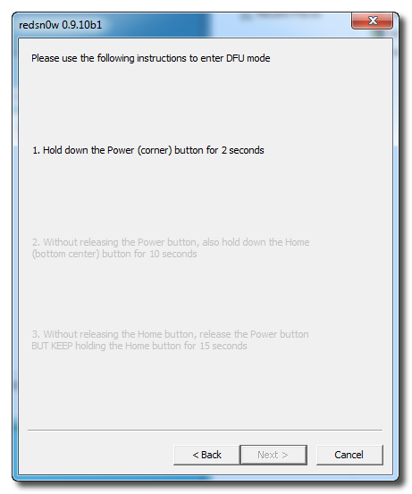 ▼ 接著請執行以下三個步驟進入DFU Mode (Device Firmware Upgrade),一、按住裝置電源鈕3秒鐘。二、接下來按住電源鈕與Home鈕10秒鐘。三、接著放開電源鈕,但要繼續按著Home鈕15秒鐘,再來 Next 繼續。