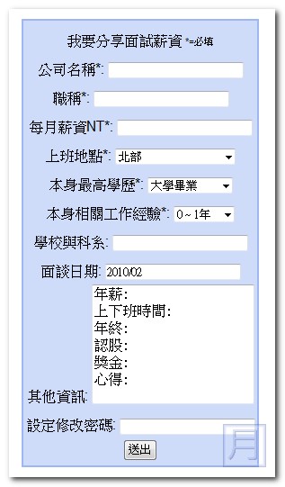 在現今不景氣的大環境中應徵工作時,要求的薪資常常是大家很難說出口的一件事,但網路上有網友設計了一個「各公司薪水薪資查詢」的搜尋平台,裡頭資料庫擁有許多在各公司工作的網友所提供的薪資、年資資訊,讓您在面試時可以大約知道這間公司給這個職務的薪資水準,讓您可以衡量想要求的最低薪資,不過建議這樣的資料僅供參考,實際的情形還要看個人的能力與條件,並非所有人都能擁有這樣的行情或是只有這樣的行情,當然您也可以提供從事過的公司薪水資訊給大家參考,讓這平台能夠服務更多的網友。