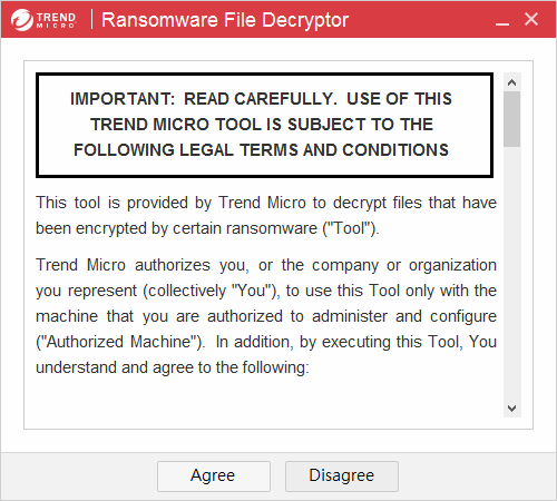 ▼ RansomwareFileDecryptor 執行後,需要請您同意使用者授權聲明(EULA),請點選 “Agree” 進行下一步。