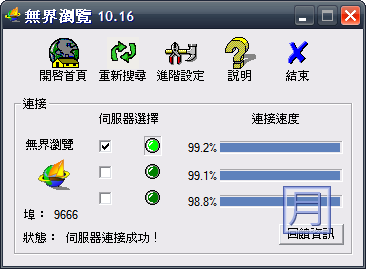 - 不斷使用,自動得到連接更新。當升級版的“無界瀏覽”推出時,在您打開主頁時,會有一窗口彈出告訴您下載新的“無界瀏覽”。