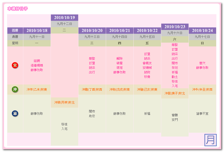 ▼ 下面還有直接列出一整個禮拜的好日子,讓您可以直接參考。